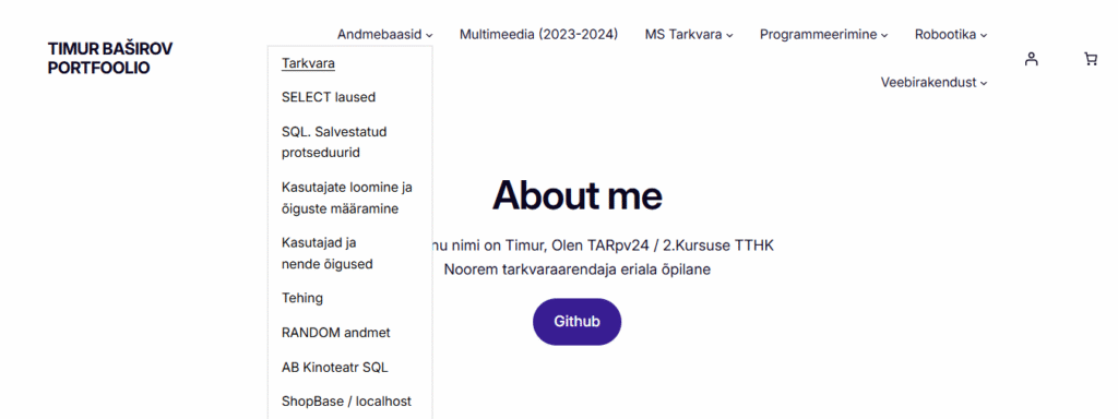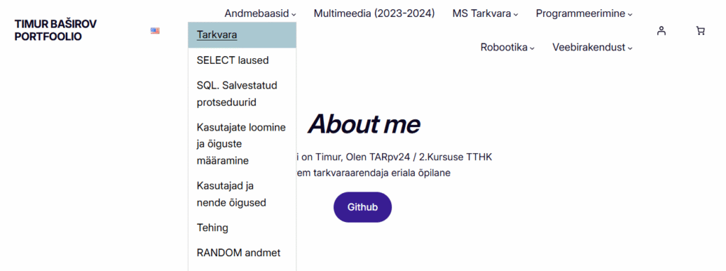 Muutsin navigeerimismenüü kirjasuurust, lisasin värvimuutuse, kui hiir viia ühe teema peale navigeerimismenüüs, ja muutsin kirja About me stiili, italic