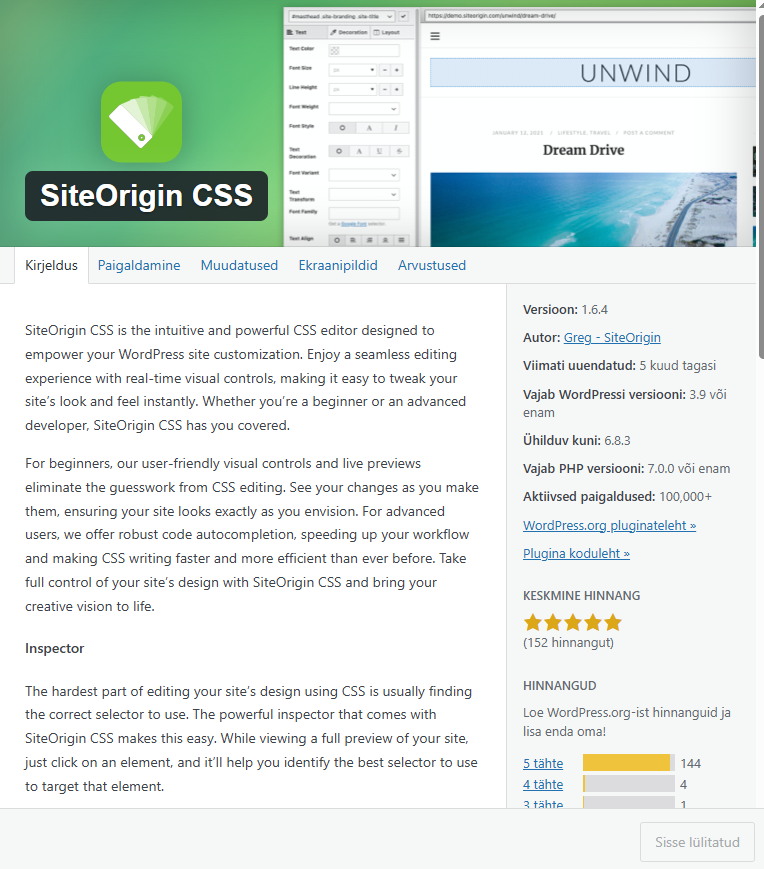 Paigaldab pistikprogrammi SiteOrigin CSS