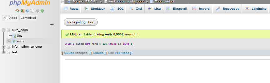 Update autod set hind = 123 where id like 1;