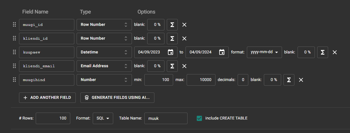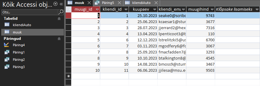 insert into muuk (muugi_id, kliendi_id, kuupaev, kliendi_email, muugihind) values (1, 1, ‘2023-10-25’, ‘seake0@scribd.com’, 9743);