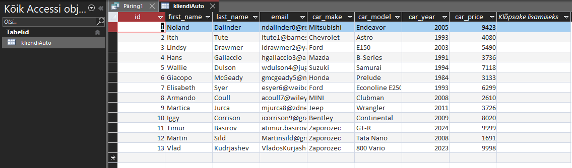 insert into kliendiAuto (id, first_name, last_name, email, car_make, car_model, car_year, car_price) values (101, 'Timur', 'Basirov', 'atimur.basirov@gmail.com', 'Nissan', 'GT-R', 2024, 9999);