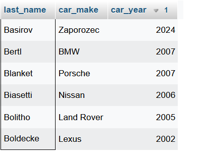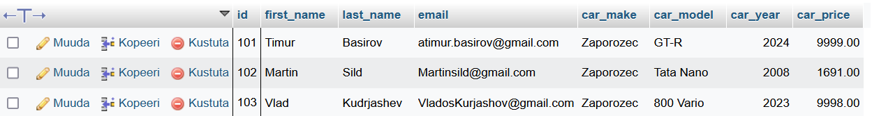 insert into kliendiAuto (id, first_name, last_name, email, car_make, car_model, car_year, car_price) values (101, 'Timur', 'Basirov', 'atimur.basirov@gmail.com', 'Nissan', 'GT-R', 2024, 9999);