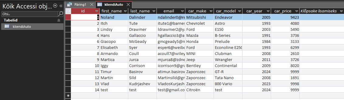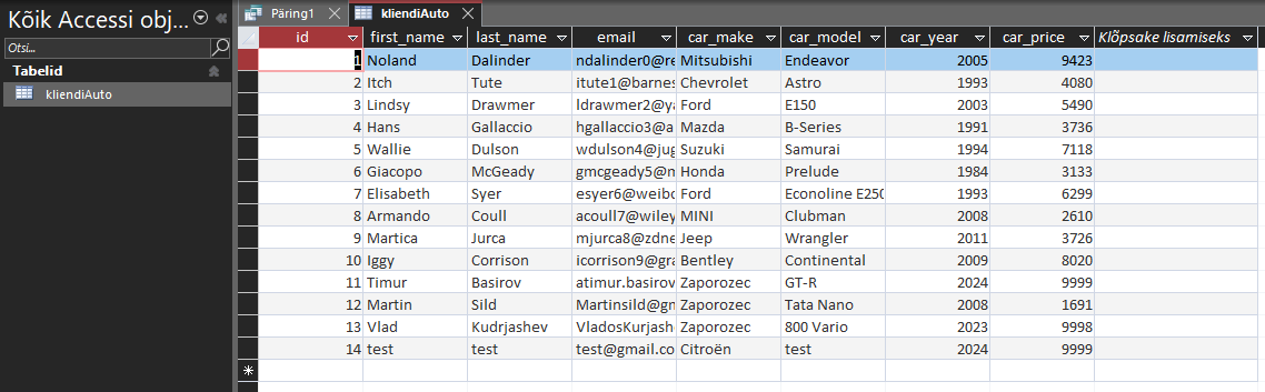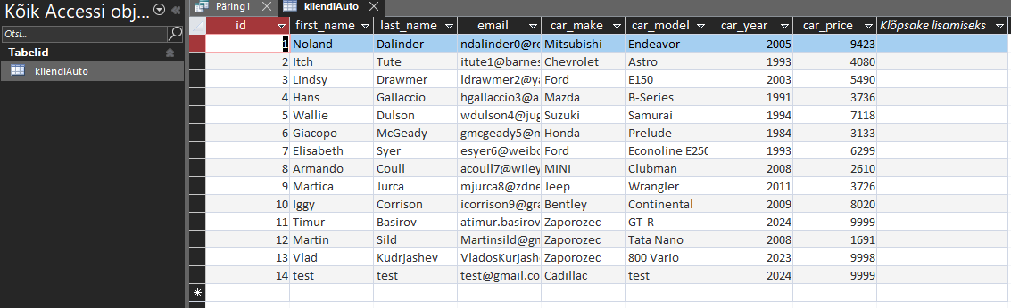 insert into kliendiAuto (id, first_name, last_name, email, car_make, car_model, car_year, car_price) values (14, 'test', 'test', 'test@gmail.com', 'Cadillac', 'test', 2024, 9999);